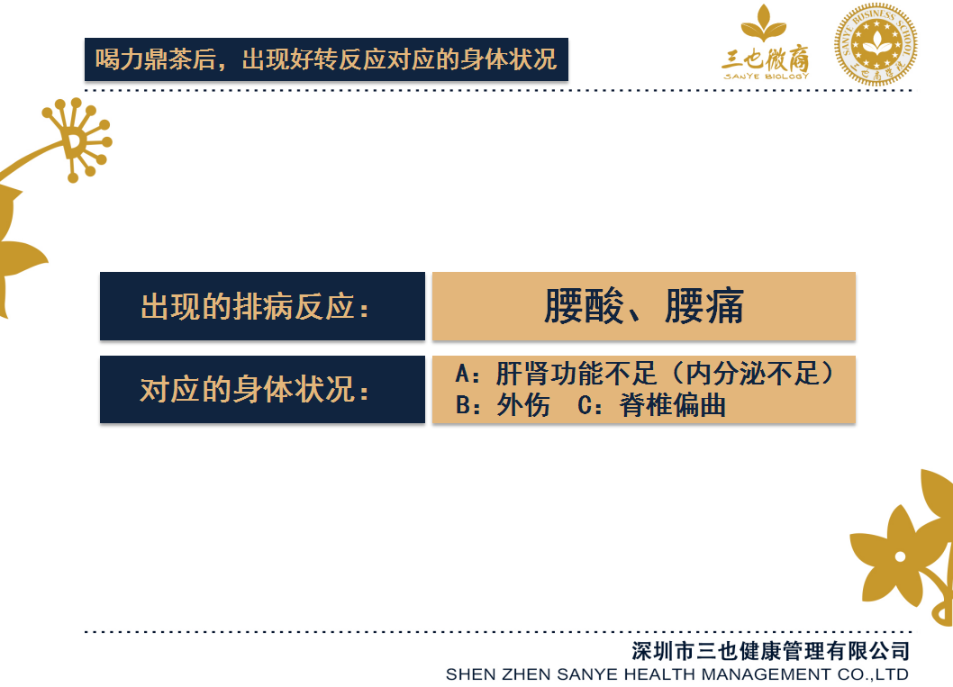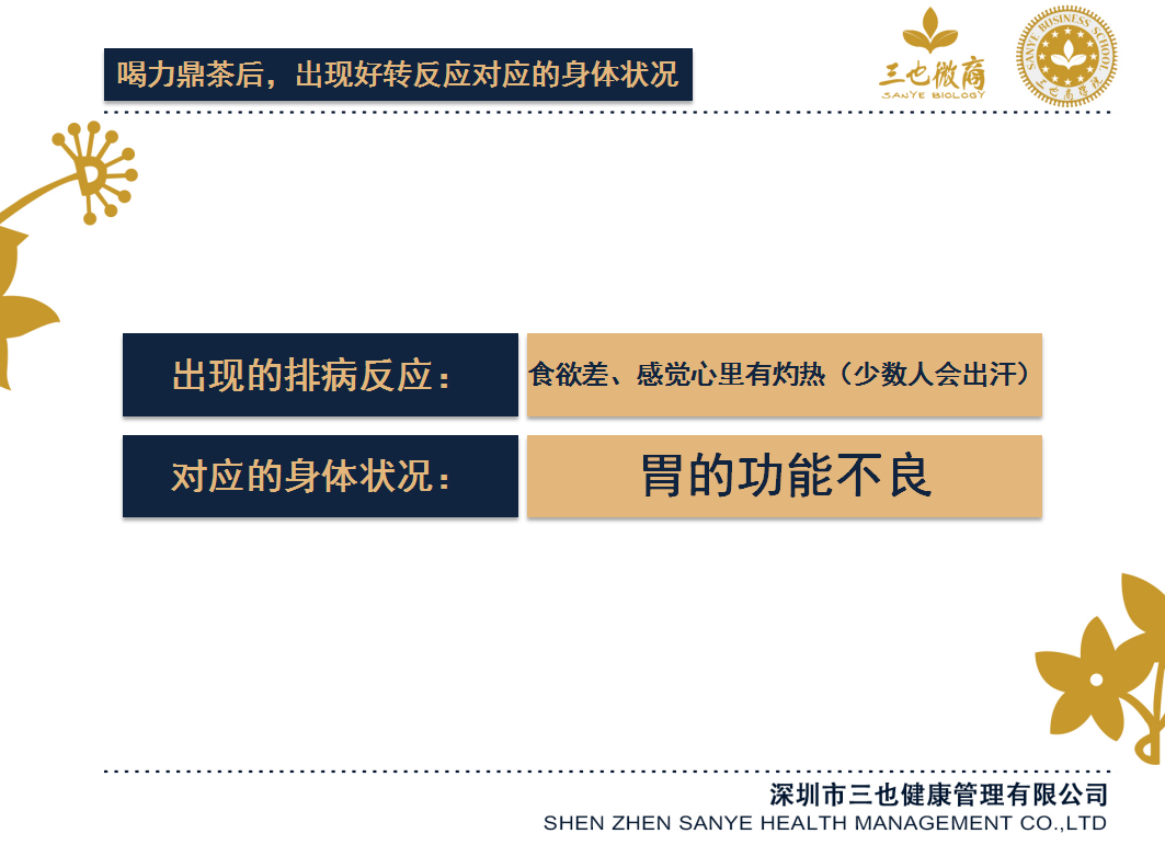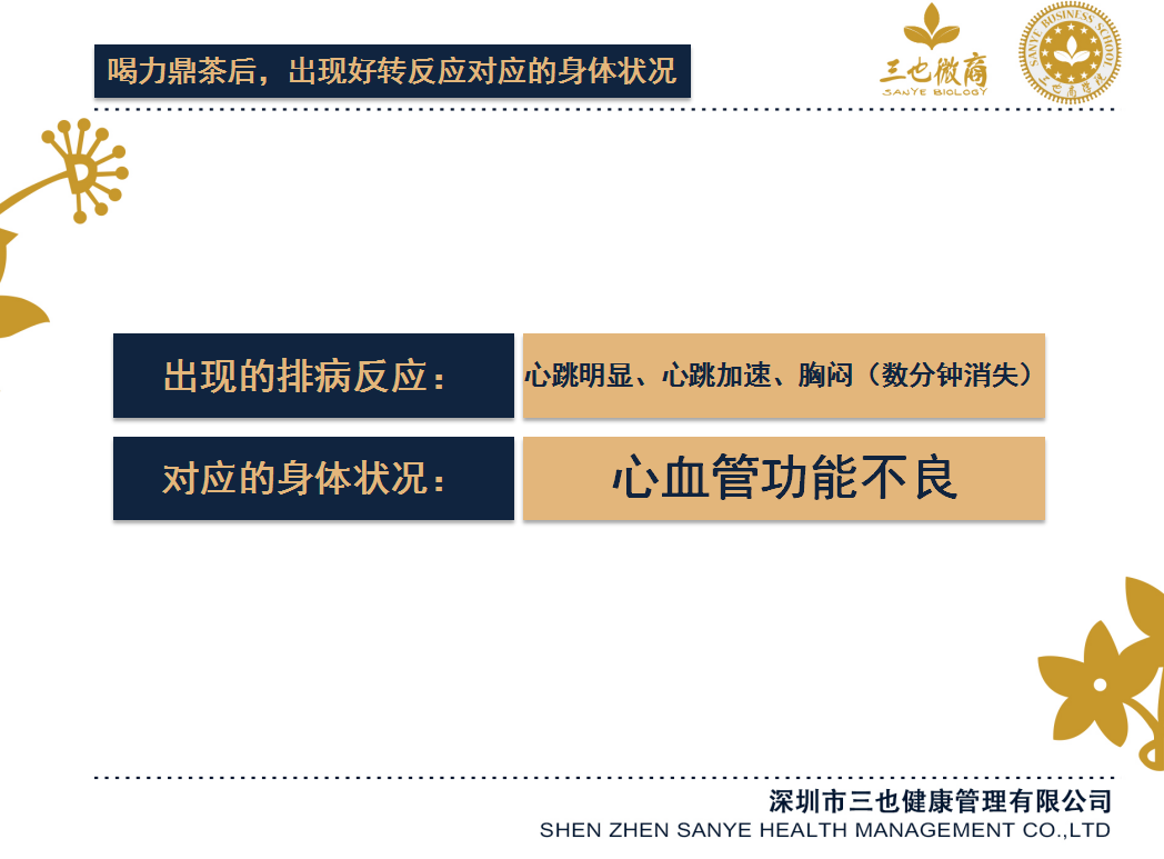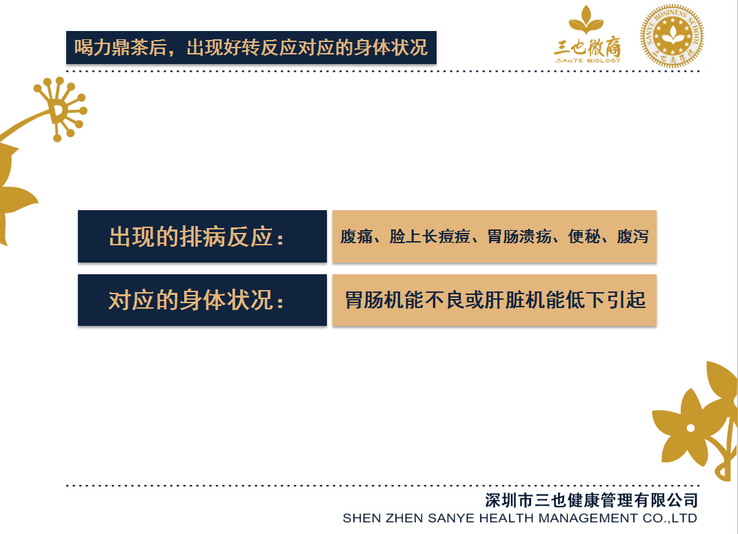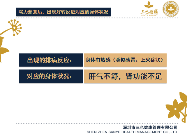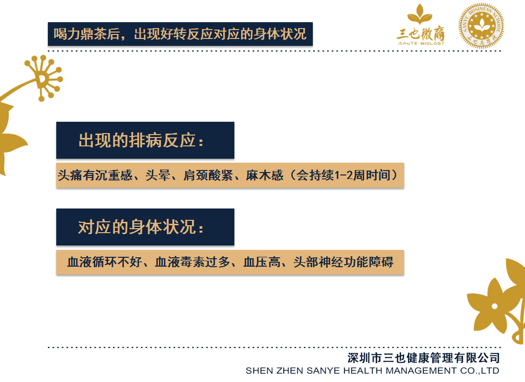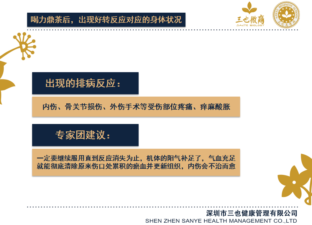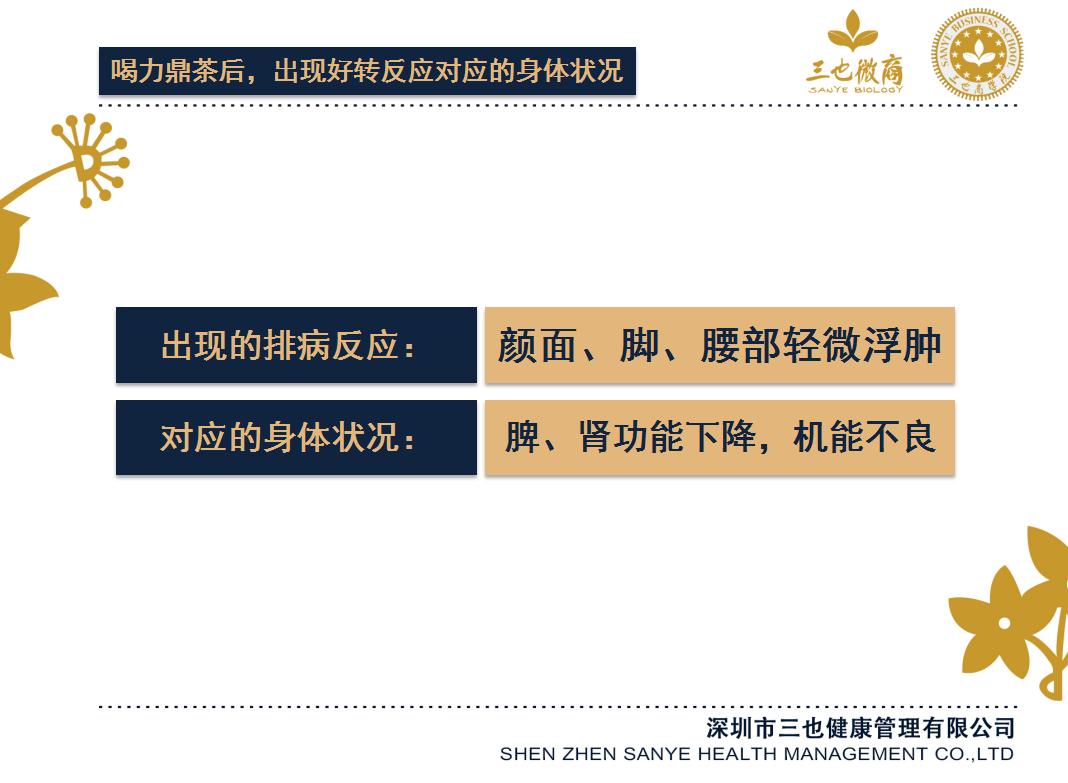 力鼎茶服用后常见好转反应 力鼎茶对于人体,还有一个超强的健康自检功能,身上隐藏的亚健康状态或者潜在疾病,都可以通过不同的反应表现出来。你喝了力鼎茶之后出现的不同排病反应,就知道身体哪里处于亚健康状态! 出现排病反应,不用担心,坚持喝,多喝温开水,适当运动,不吃辛辣刺激性食物,一般3-7天排病反应就会消失!身体机能会变好! 这一点是很多同类产品不具备的优势,喝了力鼎茶会调理身体各方面的问题,体质会变的更好,身体更健康! 喝了力鼎茶,每个人出现的排病反应不同,说明每个人的人体机能出现的问题不同,而副作用不管是什么人都会出现相同的副作用症状。喝了力鼎茶通常会有头疼,腰疼,腿疼,筋骨酸疼。而且每个人出现的反应不同,比方你喝了会头疼,而另一个人喝了会腰疼!还有变化趋势不一样,排病反应越来越轻,而副作用症状会一直存在或加重。所以喝了力鼎茶出现的身体不适不是副作用而是身体机能变好的表现! 下面看看通常有哪些反应: 头痛 1,一种是头顶痛并且头痛如裹,就像有湿布裹着头一样难受的痛,这类朋友通常体内脾湿、肝胆湿热较重,脾虚肝郁,喝了力鼎茶,在局部血循环加快的同时,原来的湿气痰聚之处就会暂时出现充血肿大现象,反射到大脑中枢,就会感知到痛。不用担心,3-7天就会好的。 2,第二种是刺痛,体内有瘀血,气滞血瘀型体质。力鼎茶里含有的人参、枸杞为补气之物,就可以改善血瘀体质,此为正常的好转反应,适应3-7天就好了。 3,第三种是头两侧疼痛,这类朋友大多数会有肝胆方面的疾病或隐患(肝功能下降或胆囊炎、胆结石等)肝经不通。肝功能下降的症状,可以搭配舒肝片一起服用。 眼袋肿大 1,肝是排毒和造血系统之一,肝开窍于目,肝的问题全表现在双眼处,肝无法排清毒素,就会形成眼袋。可搭配舒肝片一起服用,强肝解毒。 2,由于脾胃功能减弱,会导致体内积水,致使下眼睑松弛,形成眼袋。健脾祛湿,可以搭配吃一些薏米、红豆、山药、香菇等食物。 3,肾虚会发生体液代谢障碍,肾气不足,日久导致气血不畅,出现眼袋。 4,眼部周围的血液循环容易因过劳而变得淤滞,血管由于淤塞而回流不畅,造成淋巴代谢减缓,使多余的水分及血液积聚在眼睛下方,继而形成眼袋 眼睛浮肿 力鼎茶不会造成眼睛浮肿的,浮肿受生活作息影响最大,经常发生在血液循环代谢能力差的人身上,比如睡前喝水的人、经常久坐不动的、平常饮食习惯口味重的人、经常熬夜的、身体新陈代谢差的人。 力鼎茶是促进新陈代谢的,刚开始喝的时候,会打通气血,尤其血液循环系统效果差的人,来不及将体内多余的废水排出去,水分滞留在微血管内,甚至回渗到皮肤中,便产生了膨胀浮肿现象。 后腰很酸 血循环通畅了,男根勃起时间加长了,长时间的勃起会导致后腰酸。 腰疼 此前是否有腰肌劳损、椎间盘突出、肾虚(都有很多种表现,有人腹痛,有人腰痛)喝3-7天就会好的。 阴囊疼痛、阴茎疼、睾丸疼、大腿根儿周围都疼 首先需要了解是否有存在生殖器炎症?如前列腺炎、尿道炎、睾丸炎、甚至精索炎,这些炎症存在时,症状轻的平时客户是感觉不大的,但是力鼎茶是温阳补肾、促进血液循环,所以是升发的过程,有这些炎症的客户服用力鼎茶后典型的好转反应就是局部疼痛,出现的时间是服用后1-7天,持续时间3-7天不等,身体约虚弱,好转反应越强烈。 如没有炎症,可能阴虚体质。 阴虚体质的人性情较急躁,常常心烦易怒、房事不节、失精。服用力鼎茶是阴阳双补,肝肾同调,平衡的过程,阴虚很容易肝火旺盛,导致脏腑机能失调,易出现体内阴液不足,阴虚生内热,津液消耗快,容易出现上火等症状,是典型的好转反应。不用担心,3-7天会好。 小腹痛 本身肝肾虚,喝了力鼎茶之后,虚损的气血在一点一点提起来的时候,就会正邪相搏,出现不适,小腹痛就是肝肾功能在调节时的一个正常反应。这期间多喝湿热白开水,加快代谢物的排出,3-7天自行慢慢缓解。 浑身疼痛 大多是气血不和且体内有寒湿的,此类人平时容易长湿疹、易痰多咳嗽等,有的还会有体癣、脚癣等。适应3-7天就好了 头晕 一般都是脾胃和肝功能不好的,也有血虚(贫血)、血瘀(经常手脚麻,血循环不好的),有颈椎病的 犯困没精神 肾阳虚衰,平时怕冷,夜尿频多,易失眠的。脾阳不振,要么肥胖,要么很瘦的。继续按疗程服用。 呕吐 肝胃有问题或是脾虚严重的,在调节期间出现呕吐,是人体在调节自身时的一个自我保护,以前没喝力鼎茶之前,气血太弱,连把肝肾里的垃圾排出来的能力都没有,现在喝了力鼎茶能排出来是件好事。这期间多喝湿热白开水,加快代谢物的排出,3-7天自行慢慢缓解。 流鼻血 ①爱流鼻血的人是肺经有热,我们说肝肺相乘侮,在调节肝肾的过程中,其他三脏也都得到了深度调节。②还有一种情况就是,看一看是不是阴虚内热体质,如果是阴虚内热,又有肝肾虚的情况,可以观察下,流鼻血的次数和时间。日常生活中加大蔬菜,尤其是绿叶菜、大白菜这些具有滋阴功效的食物,再加上多喝白开水,3-7天正常也会缓解恢复。 失眠 这类朋友大多也是有脾虚肝郁的现象。可以让顾客喝些夏枯草桑叶菊花茶,也可以药店购买“夏桑菊颗粒”。同时多喝温热的白开水。因为力鼎茶里面也含有牛磺酸,如果失眠严重,可以适当调整服用时间,早晨喝。 甲状腺肿大 甲状腺问题,在中医讲是“瘿瘤”范畴 