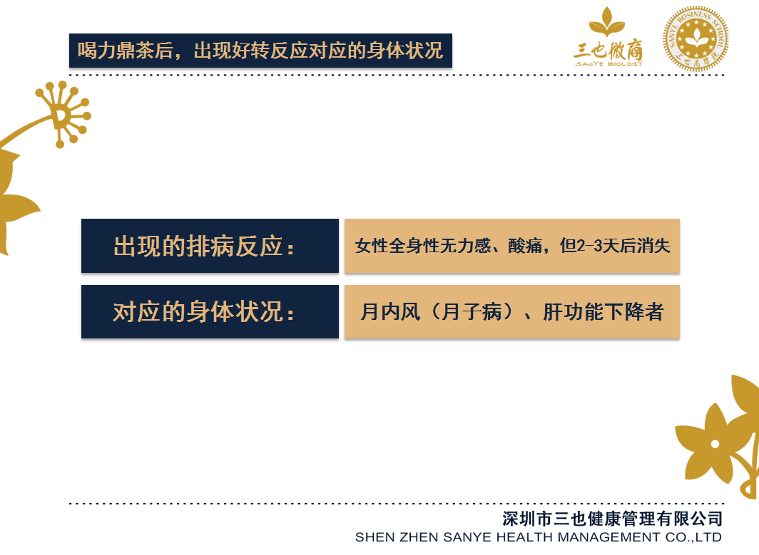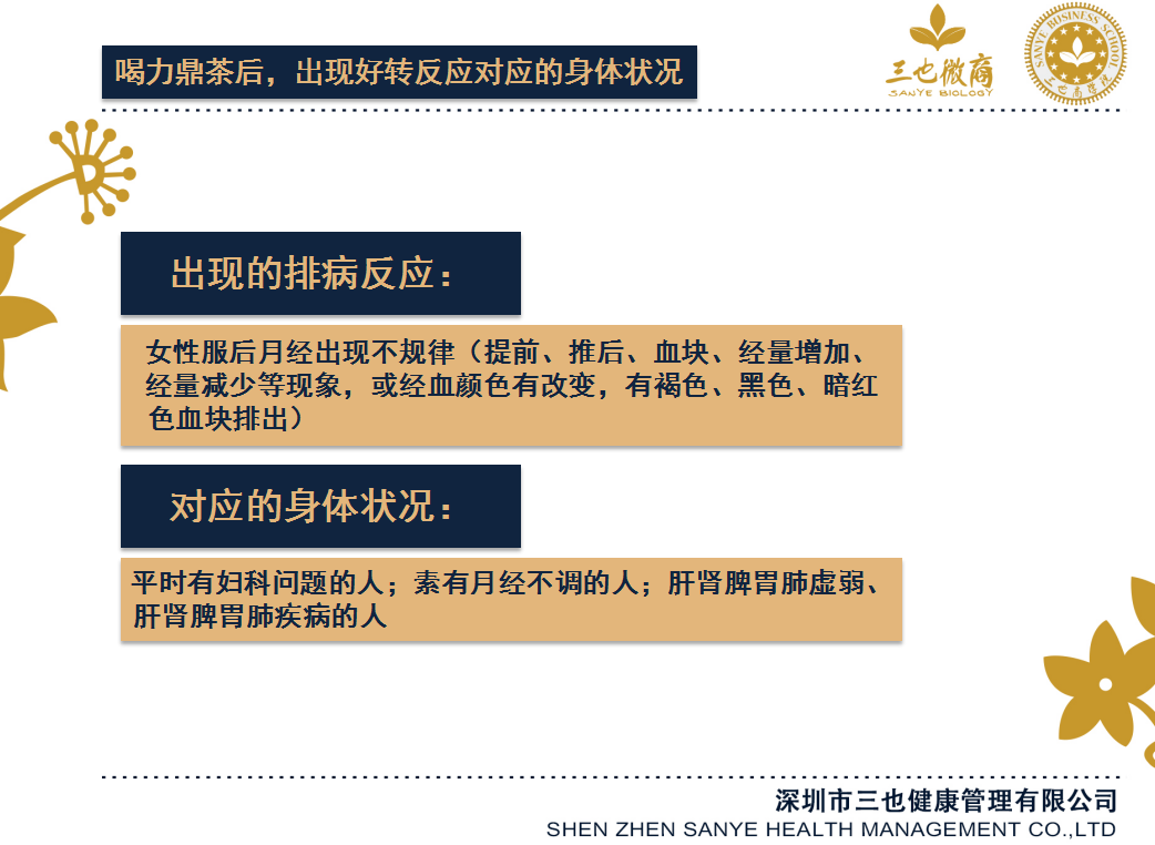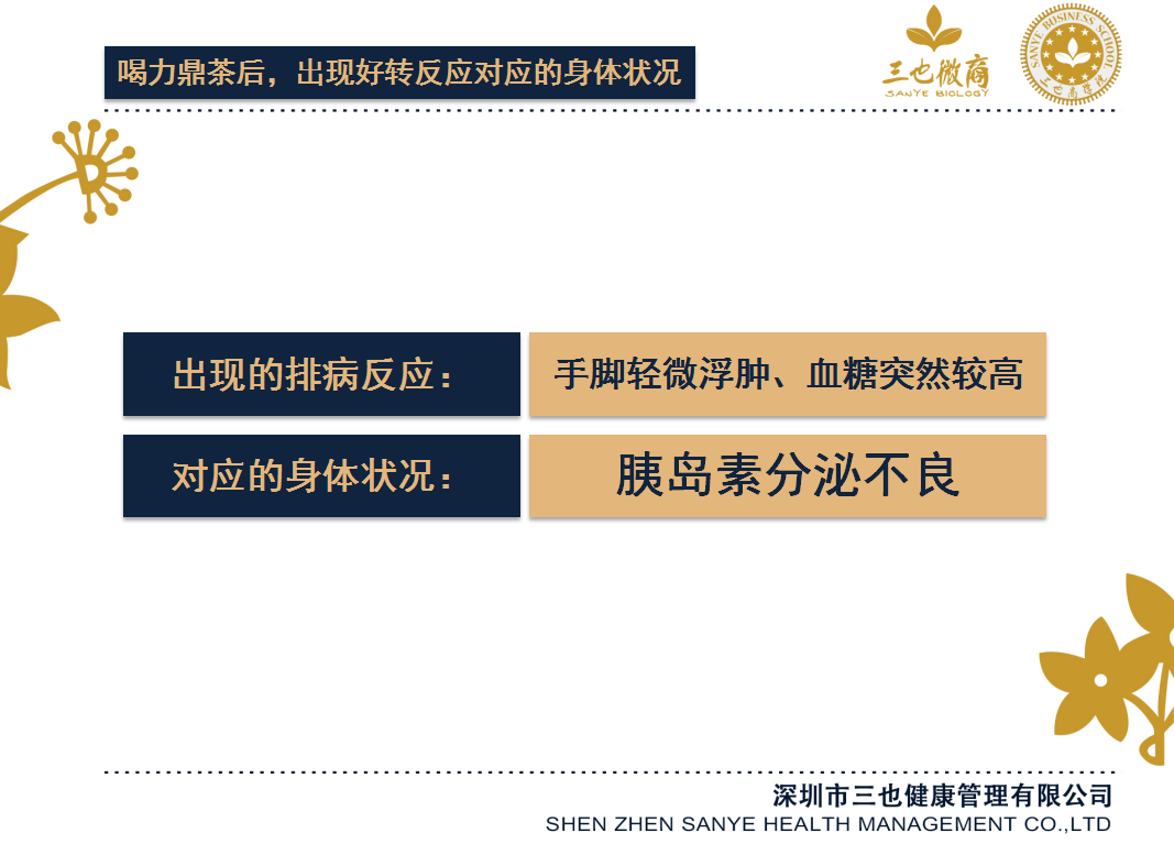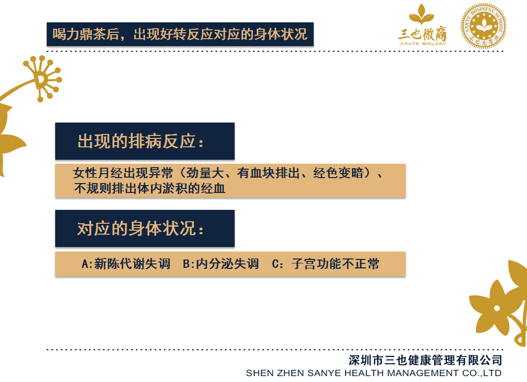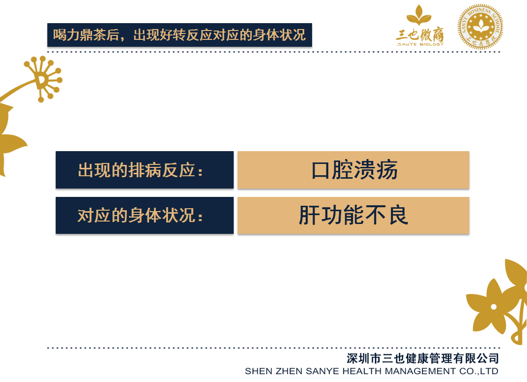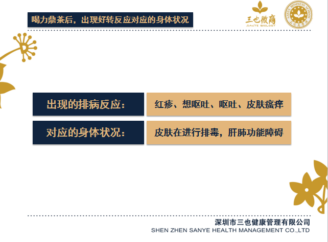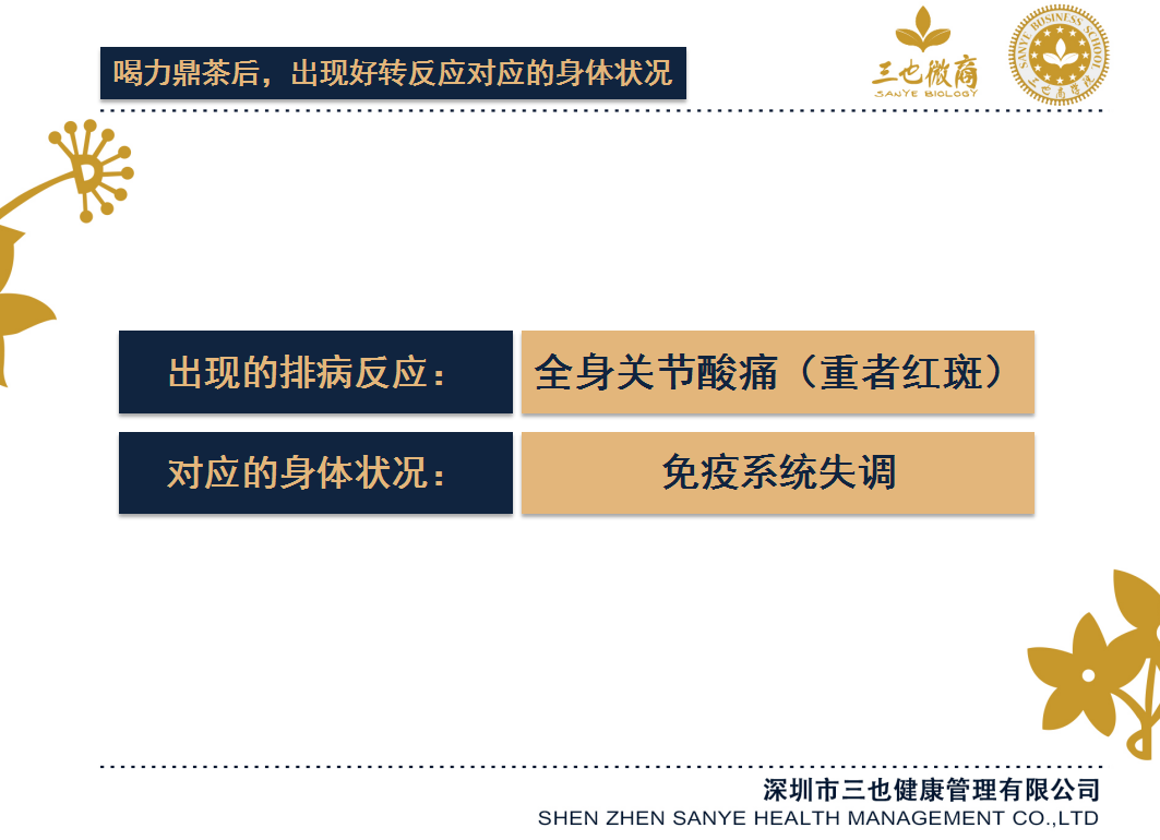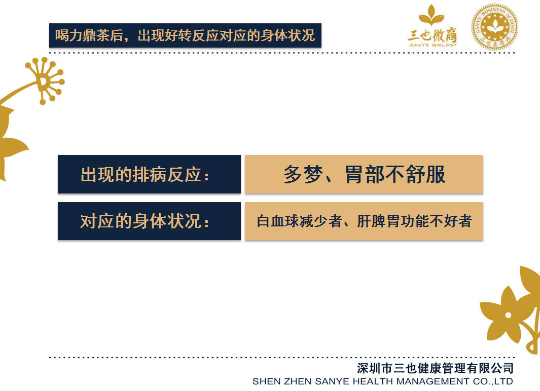 力鼎茶服用后常见好转反应 力鼎茶对于人体,还有一个超强的健康自检功能,身上隐藏的亚健康状态或者潜在疾病,都可以通过不同的反应表现出来。你喝了力鼎茶之后出现的不同排病反应,就知道身体哪里处于亚健康状态! 出现排病反应,不用担心,坚持喝,多喝温开水,适当运动,不吃辛辣刺激性食物,一般3-7天排病反应就会消失!身体机能会变好! 这一点是很多同类产品不具备的优势,喝了力鼎茶会调理身体各方面的问题,体质会变的更好,身体更健康! 喝了力鼎茶,每个人出现的排病反应不同,说明每个人的人体机能出现的问题不同,而副作用不管是什么人都会出现相同的副作用症状。喝了力鼎茶通常会有头疼,腰疼,腿疼,筋骨酸疼。而且每个人出现的反应不同,比方你喝了会头疼,而另一个人喝了会腰疼!还有变化趋势不一样,排病反应越来越轻,而副作用症状会一直存在或加重。所以喝了力鼎茶出现的身体不适不是副作用而是身体机能变好的表现! 下面看看通常有哪些反应: 头痛 1,一种是头顶痛并且头痛如裹,就像有湿布裹着头一样难受的痛,这类朋友通常体内脾湿、肝胆湿热较重,脾虚肝郁,喝了力鼎茶,在局部血循环加快的同时,原来的湿气痰聚之处就会暂时出现充血肿大现象,反射到大脑中枢,就会感知到痛。不用担心,3-7天就会好的。 2,第二种是刺痛,体内有瘀血,气滞血瘀型体质。力鼎茶里含有的人参、枸杞为补气之物,就可以改善血瘀体质,此为正常的好转反应,适应3-7天就好了。 3,第三种是头两侧疼痛,这类朋友大多数会有肝胆方面的疾病或隐患(肝功能下降或胆囊炎、胆结石等)肝经不通。肝功能下降的症状,可以搭配舒肝片一起服用。 眼袋肿大 1,肝是排毒和造血系统之一,肝开窍于目,肝的问题全表现在双眼处,肝无法排清毒素,就会形成眼袋。可搭配舒肝片一起服用,强肝解毒。 2,由于脾胃功能减弱,会导致体内积水,致使下眼睑松弛,形成眼袋。健脾祛湿,可以搭配吃一些薏米、红豆、山药、香菇等食物。 3,肾虚会发生体液代谢障碍,肾气不足,日久导致气血不畅,出现眼袋。 4,眼部周围的血液循环容易因过劳而变得淤滞,血管由于淤塞而回流不畅,造成淋巴代谢减缓,使多余的水分及血液积聚在眼睛下方,继而形成眼袋 眼睛浮肿 力鼎茶不会造成眼睛浮肿的,浮肿受生活作息影响最大,经常发生在血液循环代谢能力差的人身上,比如睡前喝水的人、经常久坐不动的、平常饮食习惯口味重的人、经常熬夜的、身体新陈代谢差的人。 力鼎茶是促进新陈代谢的,刚开始喝的时候,会打通气血,尤其血液循环系统效果差的人,来不及将体内多余的废水排出去,水分滞留在微血管内,甚至回渗到皮肤中,便产生了膨胀浮肿现象。 后腰很酸 血循环通畅了,男根勃起时间加长了,长时间的勃起会导致后腰酸。 腰疼 此前是否有腰肌劳损、椎间盘突出、肾虚(都有很多种表现,有人腹痛,有人腰痛)喝3-7天就会好的。 阴囊疼痛、阴茎疼、睾丸疼、大腿根儿周围都疼 首先需要了解是否有存在生殖器炎症?如前列腺炎、尿道炎、睾丸炎、甚至精索炎,这些炎症存在时,症状轻的平时客户是感觉不大的,但是力鼎茶是温阳补肾、促进血液循环,所以是升发的过程,有这些炎症的客户服用力鼎茶后典型的好转反应就是局部疼痛,出现的时间是服用后1-7天,持续时间3-7天不等,身体约虚弱,好转反应越强烈。 如没有炎症,可能阴虚体质。 阴虚体质的人性情较急躁,常常心烦易怒、房事不节、失精。服用力鼎茶是阴阳双补,肝肾同调,平衡的过程,阴虚很容易肝火旺盛,导致脏腑机能失调,易出现体内阴液不足,阴虚生内热,津液消耗快,容易出现上火等症状,是典型的好转反应。不用担心,3-7天会好。 小腹痛 本身肝肾虚,喝了力鼎茶之后,虚损的气血在一点一点提起来的时候,就会正邪相搏,出现不适,小腹痛就是肝肾功能在调节时的一个正常反应。这期间多喝湿热白开水,加快代谢物的排出,3-7天自行慢慢缓解。 浑身疼痛 大多是气血不和且体内有寒湿的,此类人平时容易长湿疹、易痰多咳嗽等,有的还会有体癣、脚癣等。适应3-7天就好了 头晕 一般都是脾胃和肝功能不好的,也有血虚(贫血)、血瘀(经常手脚麻,血循环不好的),有颈椎病的 犯困没精神 肾阳虚衰,平时怕冷,夜尿频多,易失眠的。脾阳不振,要么肥胖,要么很瘦的。继续按疗程服用。 呕吐 肝胃有问题或是脾虚严重的,在调节期间出现呕吐,是人体在调节自身时的一个自我保护,以前没喝力鼎茶之前,气血太弱,连把肝肾里的垃圾排出来的能力都没有,现在喝了力鼎茶能排出来是件好事。这期间多喝湿热白开水,加快代谢物的排出,3-7天自行慢慢缓解。 流鼻血 ①爱流鼻血的人是肺经有热,我们说肝肺相乘侮,在调节肝肾的过程中,其他三脏也都得到了深度调节。②还有一种情况就是,看一看是不是阴虚内热体质,如果是阴虚内热,又有肝肾虚的情况,可以观察下,流鼻血的次数和时间。日常生活中加大蔬菜,尤其是绿叶菜、大白菜这些具有滋阴功效的食物,再加上多喝白开水,3-7天正常也会缓解恢复。 失眠 这类朋友大多也是有脾虚肝郁的现象。可以让顾客喝些夏枯草桑叶菊花茶,也可以药店购买“夏桑菊颗粒”。同时多喝温热的白开水。因为力鼎茶里面也含有牛磺酸,如果失眠严重,可以适当调整服用时间,早晨喝。 甲状腺肿大 甲状腺问题,在中医讲是“瘿瘤”范畴 