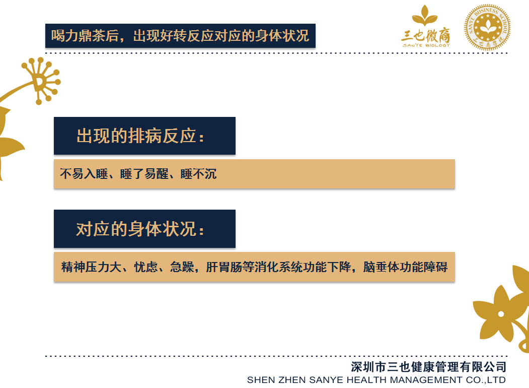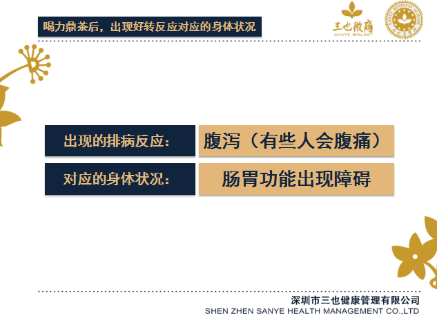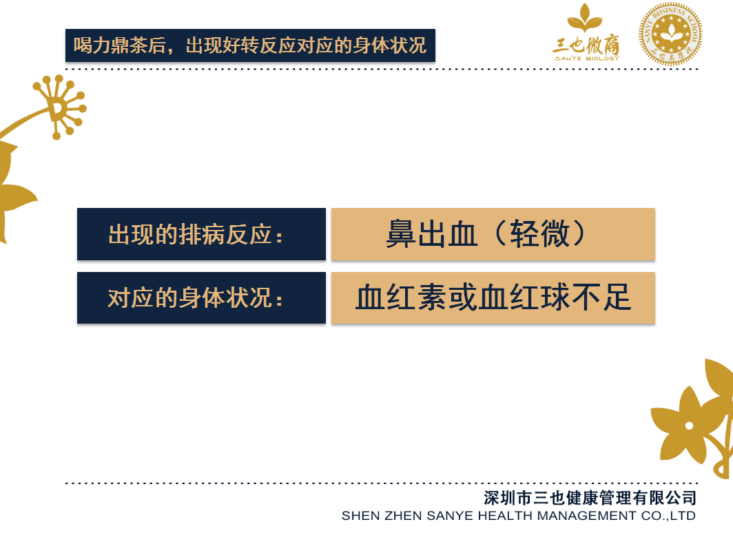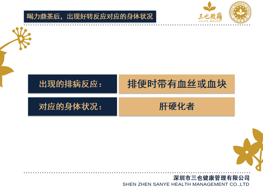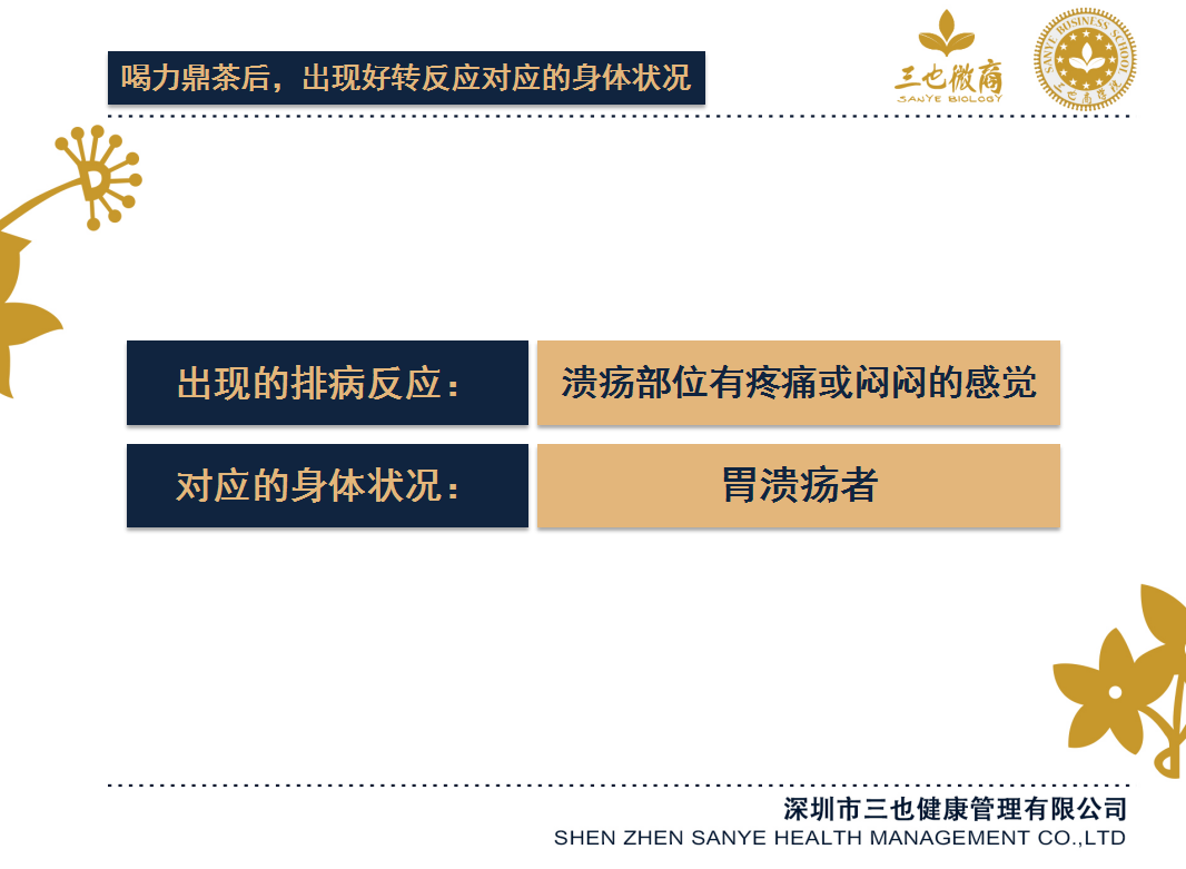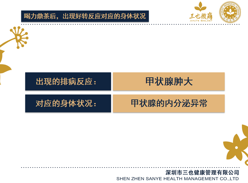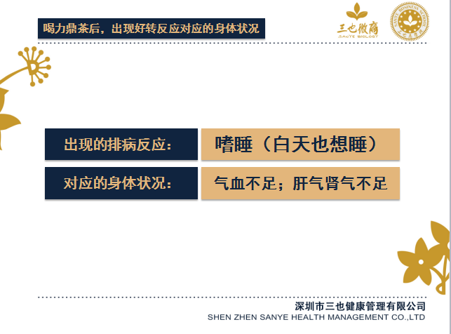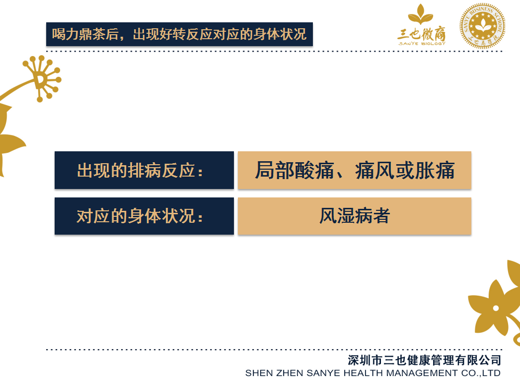 力鼎茶服用后常见好转反应 力鼎茶对于人体,还有一个超强的健康自检功能,身上隐藏的亚健康状态或者潜在疾病,都可以通过不同的反应表现出来。你喝了力鼎茶之后出现的不同排病反应,就知道身体哪里处于亚健康状态! 出现排病反应,不用担心,坚持喝,多喝温开水,适当运动,不吃辛辣刺激性食物,一般3-7天排病反应就会消失!身体机能会变好! 这一点是很多同类产品不具备的优势,喝了力鼎茶会调理身体各方面的问题,体质会变的更好,身体更健康! 喝了力鼎茶,每个人出现的排病反应不同,说明每个人的人体机能出现的问题不同,而副作用不管是什么人都会出现相同的副作用症状。喝了力鼎茶通常会有头疼,腰疼,腿疼,筋骨酸疼。而且每个人出现的反应不同,比方你喝了会头疼,而另一个人喝了会腰疼!还有变化趋势不一样,排病反应越来越轻,而副作用症状会一直存在或加重。所以喝了力鼎茶出现的身体不适不是副作用而是身体机能变好的表现! 下面看看通常有哪些反应: 头痛 1,一种是头顶痛并且头痛如裹,就像有湿布裹着头一样难受的痛,这类朋友通常体内脾湿、肝胆湿热较重,脾虚肝郁,喝了力鼎茶,在局部血循环加快的同时,原来的湿气痰聚之处就会暂时出现充血肿大现象,反射到大脑中枢,就会感知到痛。不用担心,3-7天就会好的。 2,第二种是刺痛,体内有瘀血,气滞血瘀型体质。力鼎茶里含有的人参、枸杞为补气之物,就可以改善血瘀体质,此为正常的好转反应,适应3-7天就好了。 3,第三种是头两侧疼痛,这类朋友大多数会有肝胆方面的疾病或隐患(肝功能下降或胆囊炎、胆结石等)肝经不通。肝功能下降的症状,可以搭配舒肝片一起服用。 眼袋肿大 1,肝是排毒和造血系统之一,肝开窍于目,肝的问题全表现在双眼处,肝无法排清毒素,就会形成眼袋。可搭配舒肝片一起服用,强肝解毒。 2,由于脾胃功能减弱,会导致体内积水,致使下眼睑松弛,形成眼袋。健脾祛湿,可以搭配吃一些薏米、红豆、山药、香菇等食物。 3,肾虚会发生体液代谢障碍,肾气不足,日久导致气血不畅,出现眼袋。 4,眼部周围的血液循环容易因过劳而变得淤滞,血管由于淤塞而回流不畅,造成淋巴代谢减缓,使多余的水分及血液积聚在眼睛下方,继而形成眼袋 眼睛浮肿 力鼎茶不会造成眼睛浮肿的,浮肿受生活作息影响最大,经常发生在血液循环代谢能力差的人身上,比如睡前喝水的人、经常久坐不动的、平常饮食习惯口味重的人、经常熬夜的、身体新陈代谢差的人。 力鼎茶是促进新陈代谢的,刚开始喝的时候,会打通气血,尤其血液循环系统效果差的人,来不及将体内多余的废水排出去,水分滞留在微血管内,甚至回渗到皮肤中,便产生了膨胀浮肿现象。 后腰很酸 血循环通畅了,男根勃起时间加长了,长时间的勃起会导致后腰酸。 腰疼 此前是否有腰肌劳损、椎间盘突出、肾虚(都有很多种表现,有人腹痛,有人腰痛)喝3-7天就会好的。 阴囊疼痛、阴茎疼、睾丸疼、大腿根儿周围都疼 首先需要了解是否有存在生殖器炎症?如前列腺炎、尿道炎、睾丸炎、甚至精索炎,这些炎症存在时,症状轻的平时客户是感觉不大的,但是力鼎茶是温阳补肾、促进血液循环,所以是升发的过程,有这些炎症的客户服用力鼎茶后典型的好转反应就是局部疼痛,出现的时间是服用后1-7天,持续时间3-7天不等,身体约虚弱,好转反应越强烈。 如没有炎症,可能阴虚体质。 阴虚体质的人性情较急躁,常常心烦易怒、房事不节、失精。服用力鼎茶是阴阳双补,肝肾同调,平衡的过程,阴虚很容易肝火旺盛,导致脏腑机能失调,易出现体内阴液不足,阴虚生内热,津液消耗快,容易出现上火等症状,是典型的好转反应。不用担心,3-7天会好。 小腹痛 本身肝肾虚,喝了力鼎茶之后,虚损的气血在一点一点提起来的时候,就会正邪相搏,出现不适,小腹痛就是肝肾功能在调节时的一个正常反应。这期间多喝湿热白开水,加快代谢物的排出,3-7天自行慢慢缓解。 浑身疼痛 大多是气血不和且体内有寒湿的,此类人平时容易长湿疹、易痰多咳嗽等,有的还会有体癣、脚癣等。适应3-7天就好了 头晕 一般都是脾胃和肝功能不好的,也有血虚(贫血)、血瘀(经常手脚麻,血循环不好的),有颈椎病的 犯困没精神 肾阳虚衰,平时怕冷,夜尿频多,易失眠的。脾阳不振,要么肥胖,要么很瘦的。继续按疗程服用。 呕吐 肝胃有问题或是脾虚严重的,在调节期间出现呕吐,是人体在调节自身时的一个自我保护,以前没喝力鼎茶之前,气血太弱,连把肝肾里的垃圾排出来的能力都没有,现在喝了力鼎茶能排出来是件好事。这期间多喝湿热白开水,加快代谢物的排出,3-7天自行慢慢缓解。 流鼻血 ①爱流鼻血的人是肺经有热,我们说肝肺相乘侮,在调节肝肾的过程中,其他三脏也都得到了深度调节。②还有一种情况就是,看一看是不是阴虚内热体质,如果是阴虚内热,又有肝肾虚的情况,可以观察下,流鼻血的次数和时间。日常生活中加大蔬菜,尤其是绿叶菜、大白菜这些具有滋阴功效的食物,再加上多喝白开水,3-7天正常也会缓解恢复。 失眠 这类朋友大多也是有脾虚肝郁的现象。可以让顾客喝些夏枯草桑叶菊花茶,也可以药店购买“夏桑菊颗粒”。同时多喝温热的白开水。因为力鼎茶里面也含有牛磺酸,如果失眠严重,可以适当调整服用时间,早晨喝。 甲状腺肿大 甲状腺问题,在中医讲是“瘿瘤”范畴 