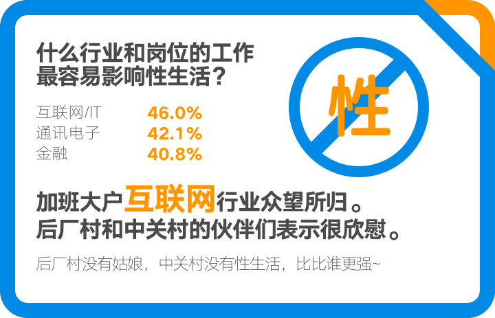 从行业角度分析,教育培训、化工能源、金融、通讯电子、IT互联网行业从业者,排在工作严重影响个人性生活的前五位。相反,农林牧渔、政府、法律、轻工贸易、医疗生物,是性生活最不易受到职业工作影响的几大行业。 从职业角度看,市场、产品、公关、财务、运营表示在性生活上很受岗位影响;行政、技术研发、销售的性生活则不怎么受影响。引人好奇的是,技术研发这个过劳死高发和频发的岗位,居然表示性生活不受岗位影响。究其原因,原来是技术研发岗位的职场人,对性生活的需求不如其他职业旺盛,对性生活也不向其他职业挑剔,寥胜于无,容易满足。