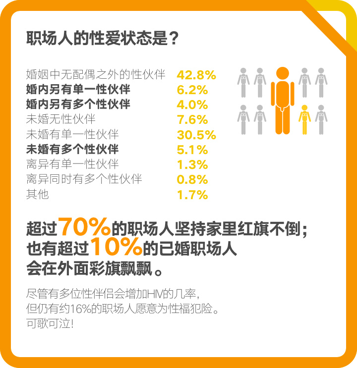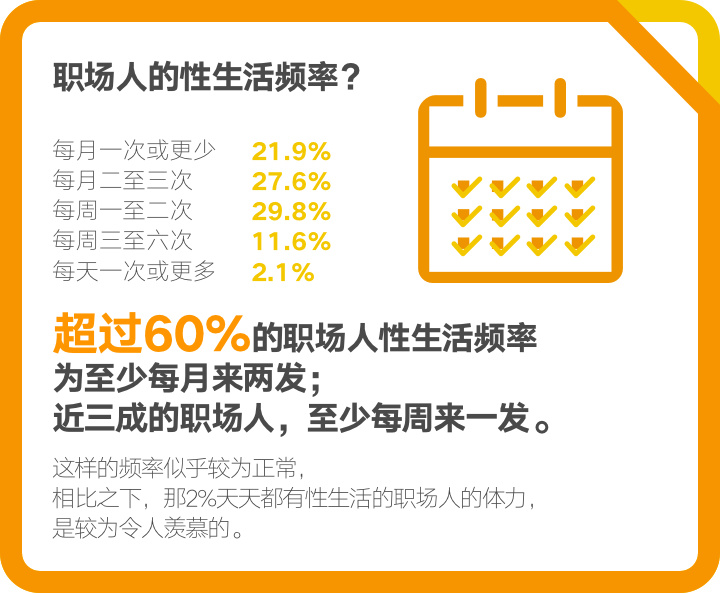 调查显示,40.1%的职场人表示,自己的职业和工作,已经影响到了自己的性生活。一部分人因为经常加班,累得影响性爱质量,甚至累得没性趣;另一部分表示出差频繁,聚少离多,很影响与伴侣的性生活;还有一些人称因为工作两地分居,十分影响。