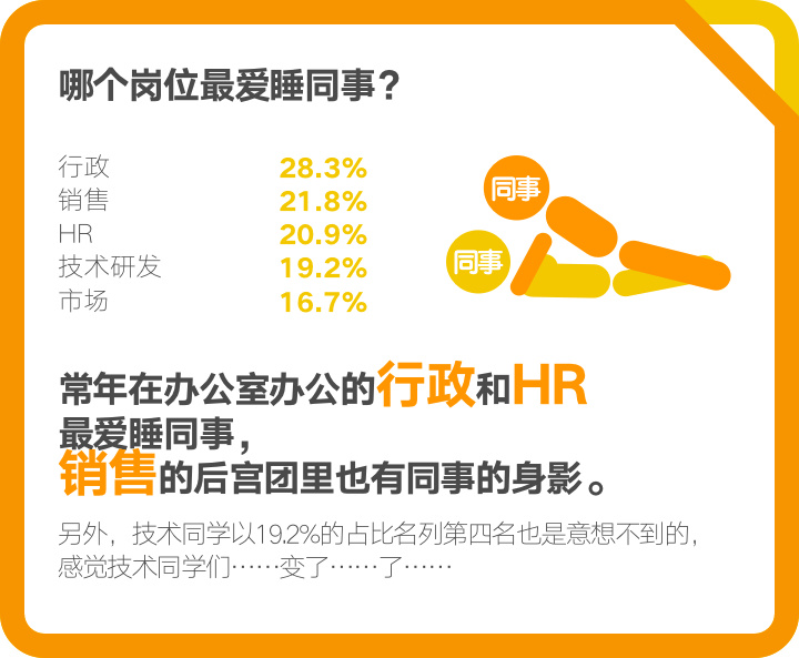 办公室恋情在各个公司是普遍被明令禁止的。一方面,办公室谈恋爱十分容易影响工作效率,关注点常在对方身上,以至于工作分心;另一方面,办公室恋情,尤其是具有上下级或者业务流程关系的两个人,十分容易联手假公济私,利用职务之便揩油。 即便如此,荷尔蒙和多巴胺的分泌,还是让职场人抑制不住对同事的吸引和上瘾。脉脉数据研究院调查显示,有18.6%的职场人表示曾与同事发生过性关系,行政、销售和HR是最爱睡同事的三大岗位。 最不爱睡同事的岗位则是财务。财务不容易有办公室恋情,原因或许有二:首先,由于财务整日与金钱打交道,财务数据不容出错,使他们普遍拥有理智和缜密的职业特性,因此在办公室恋情上也会权衡利弊,用理智战胜下半身;其次,从事财务工作的以女性偏多,男性相对较少,娘子军团队也客观地减少了与同事发生关系的概率。