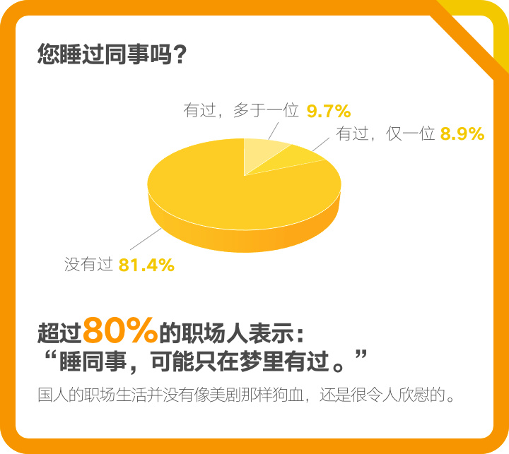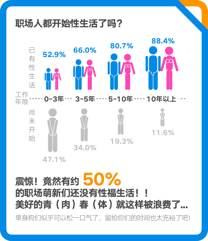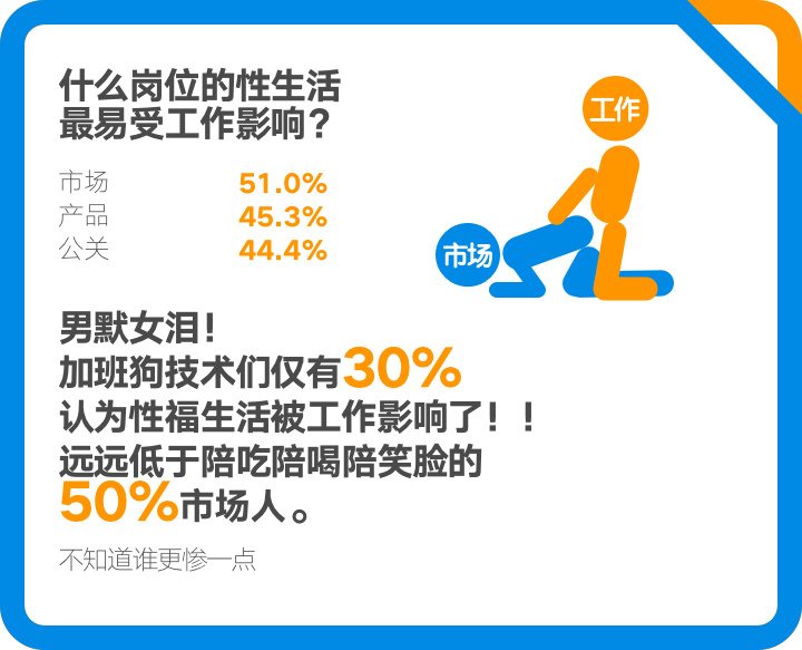 一句话证明你工作压力很大?半年没有性生活成了职场人认可度最高的神回复。近期,脉脉数据研究院对近两千名中国职场人群进行了一次性生活调查,发布了《中国职场人群性生活调查报告》。 快节奏的都市生活、高强度的工作节奏背景之下,职场人性生活满意度数据,与较高的工作生活压力,日渐变得密不可分。