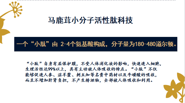 小分子活性肽,直接介入血细胞、脑和神经细胞、肌肉细胞、生殖细胞、内分泌细胞、皮肤细胞的新陈代谢,参与细胞的生长、发育、生理功能以及分裂增殖各个环节。 小分子肽具有百分之百、主动被人体吸收的特点。吸收后,不会有任何排泄物,全部被人体吸收和利用。 小分子肽不仅自身百分百被人体吸收,而且还能作为载体,促进人参、淫羊藿、刺五加、枸杞、牛碘酸、绿茶等药物成份的吸收,增强效果增强吸收率。