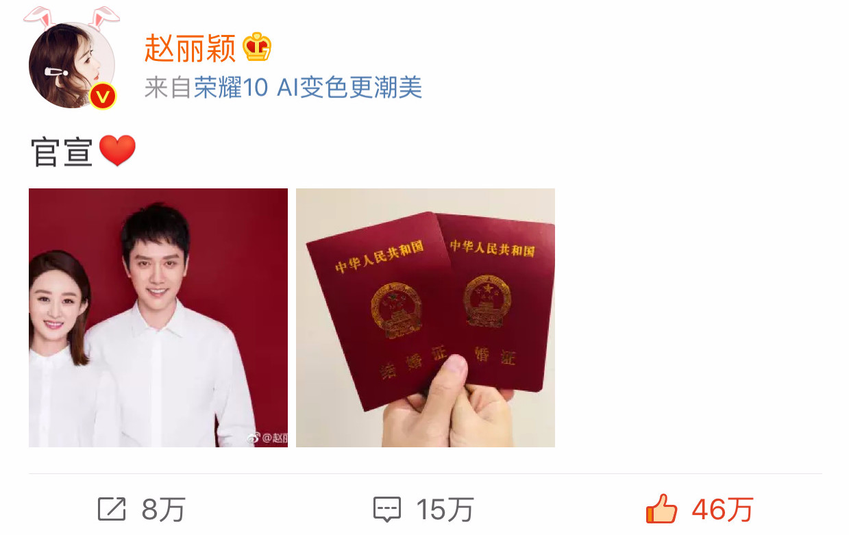 风平浪静了许久的娱乐圈,再一次炸开了锅! 就在刚刚,赵丽颖微博晒出结婚照,宣布与冯绍峰结婚了!
